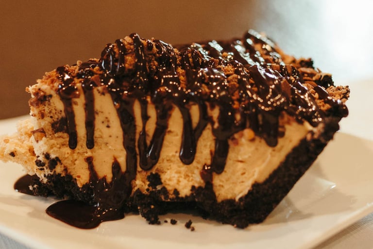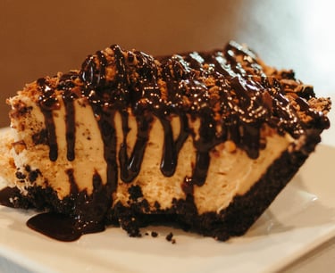 Chocolate cookie crust filled with creamy, luxurious, peanut butter mousse topped with a chocolate sauce and chopped peanut butter cups.
