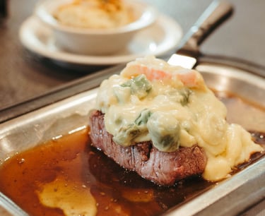 All dinners include salad bar, choice of potato and homemade bread. All steaks are topped with a deep fried, breaded onion ring.