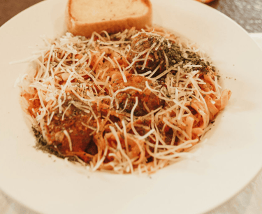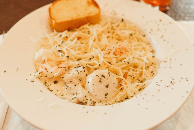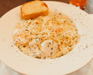 A medley of seafood (imitation crab, scallops, shrimp) served over al dente pasta and tossed in a homemade alfredo sauce.