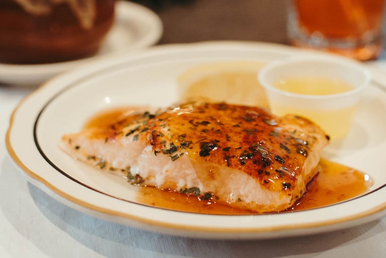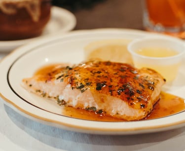 8 oz. boneless, skinless Atlantic salmon pan-seared or broiled to the perfect doneness. Served with dill sauce, orange glaze. Add pesto parmesan for an additional charge.