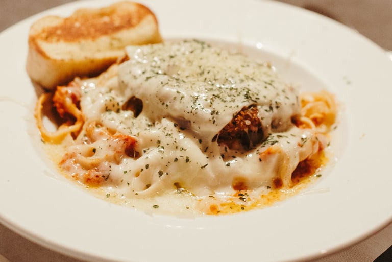 Crispy, hand breaded, Italian seasoned chicken breast over a tender helping of pasta, served with a homemade Italian marinara sauce, topped with mozzarella and parmesan cheeses.